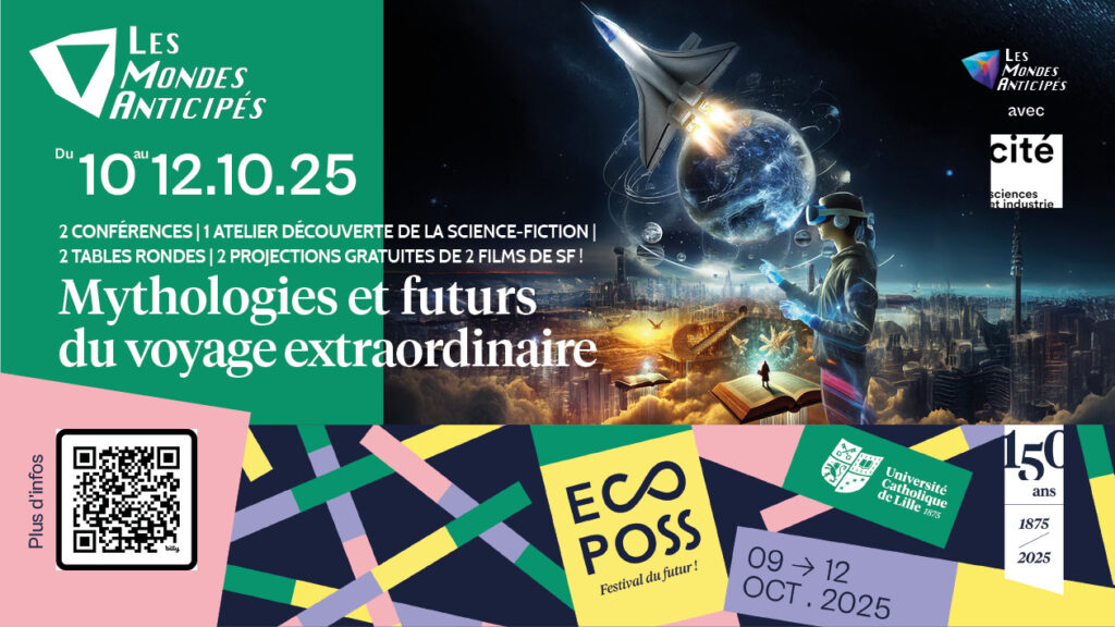 Du 10 au 11 octobre, Christian Gatard et Olivier Parent proposeront des conférences (Mythologies du Futur par Christian et Le voyage extraordinaire en SF par Olivier), une découverte de l’Arborescence de la science-fiction, deux tables rondes en ouvertures de la projection de deux films illustrant deux aspects du voyage en SF (le voyage intérieur avec Paprika, et le voyage lointain avec Interstellar). La participation des Mondes Anticipés à Ecoposs 2025 se finira, dimanche 12/10, par la conférence interactive « l’Odyssée interstellaire », un événement créé avec la Cité des sciences et de l’industrie et le planétarium de la Cité.
